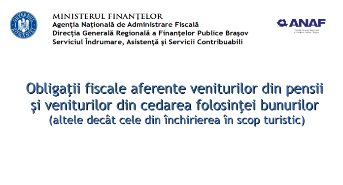 Va supunem atentiei un material oficial (cca. 44 pagini) – elaborat de Directia Generala Regionala a Finanţelor Publice BRASOV (institutie careia ii multumim pentru posibilitatea preluarii informatiilor) – ce prezinta o serie de informații cu privire la – obligaţiile fiscale aferente veniturilor din pensii și veniturilor din cedarea folosinţei bunurilor și veniturilor din cedarea folosinţei bunurilor (altele decât cele din închirierea în scop turistic)(altele decât cele din închirierea în scop turistic) – material publicat in luna decembrie 2025.