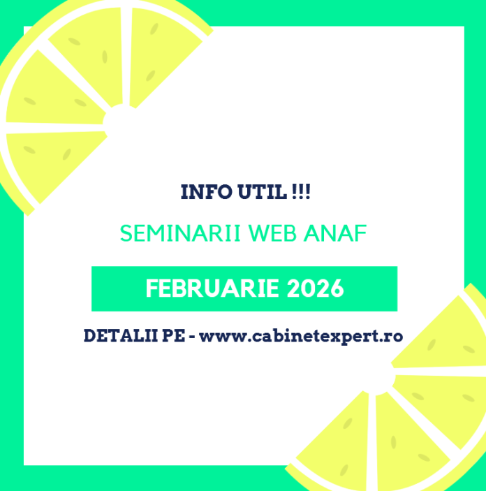 " Pentru contabilitate și salarizare - recomandăm NextUp " Durata seminariilor este de 2 ore - PENTRU LUNA FEBRUARIE 2026 . Înscrierile se pot efectua până la data şi ora începerii seminariilor, în limita locurilor disponibile. Prin continuarea procedurii de înregistrare trebuie sa...Lista SEMINARIILOR WEB ANAF - ce se vor desfășura in luna FEBRUARIE 2026 (subiecte: D 205, D 207, D 212, dividende, redirecționare impozit pe profit, etc.)