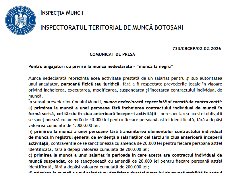 Reprezentanții Inspectoratelor Teritorial de Muncă reamintesc angajatorilor faptul că legalizarea raporturilor de muncă este esențială pentru protecția socială a lucrătorilor, inclusiv pentru acces la drepturi și pentru siguranța pe termen lung, dar si faptul ca ITM va continua controalele și dialogul cu angajatorii, pentru ca protecția celor care muncesc să nu rămână doar un principiu, ci să se vadă în practicile zilnice din fiecare loc de muncă.