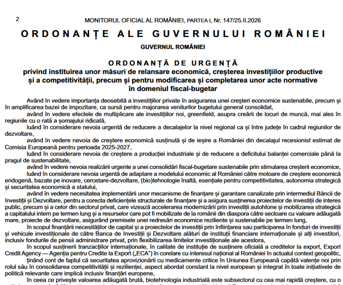 […] a fost publicata Ordonanta de Urgenta a Guvernului României nr. 8 din 24 februarie 2026 – TEXT INTEGRAL – privind instituirea unor măsuri de relansare economică, creșterea investițiilor […]
