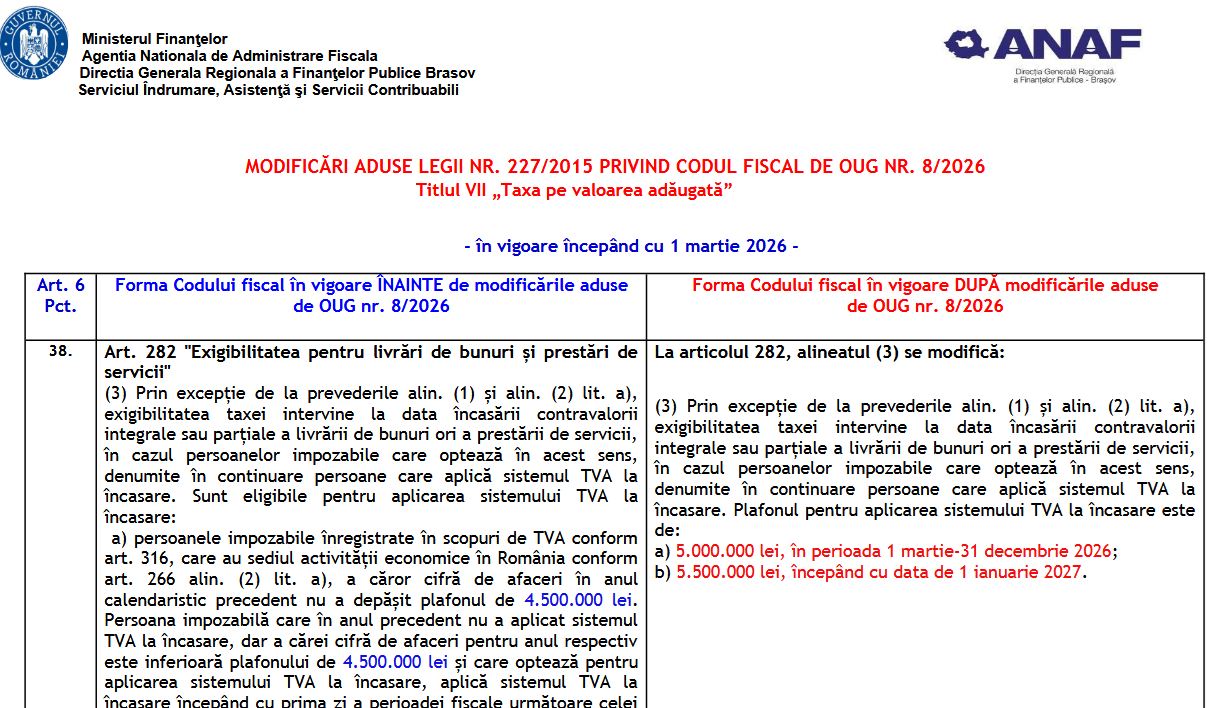 " Pentru contabilitate și salarizare - recomandăm NextUp " Va supunem atentiei un material oficial (cca. 7 pagini) - elaborat de Directia Generala Regionala a Finanţelor Publice BRASOV (institutie careia ii multumim pentru posibilitatea preluarii informatiilor) - ce prezinta o serie...Modificări aduse Legii nr. 227/2015 privind Codul Fiscal, de OUG nr. 8/2026 - la TITLUL-VII-Taxa pe valoare adăugată