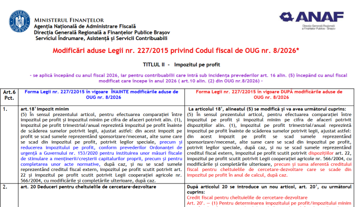 Va supunem atentiei un material oficial (cca. 10 pagini) – elaborat de Directia Generala Regionala a Finanţelor Publice BRASOV (institutie careia ii multumim pentru posibilitatea preluarii informatiilor) – ce prezinta o serie de informații cu privire la – modificările aduse Legii nr. 227/2015 privind Codul fiscal de OUG nr. 8/2026 – la TITLUL-II-Impozitul pe profit (în vigoare începând cu anul fiscal 2026) – material publicat in luna martie 2026.