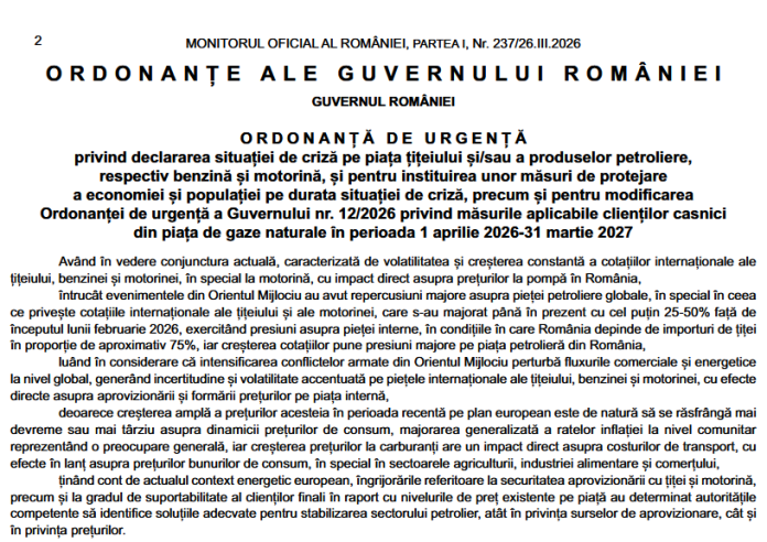 Cu o mica intarziere, va informam ca, in MONITORUL OFICIAL NR. 237 din 26 martie 2026 , a fost publicata Ordonanța de urgență a Guvernului nr. 19 din 26 martie 2026 – privind declararea situației de criză pe piața țițeiului și/sau a produselor petroliere, respectiv benzină și motorină, și pentru instituirea unor măsuri de protejare a economiei și populației pe durata situației de criză, precum și pentru modificarea Ordonanței de urgență a Guvernului nr. 12/2026 privind măsurile aplicabile clienților casnici din piața de gaze naturale în perioada 1 aprilie 2026-31 martie 2027.