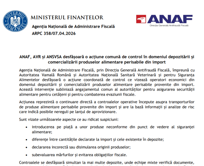 Agenția Națională de Administrare Fiscală, prin Direcția Generală Antifraudă Fiscală, împreună cu Autoritatea Vamală Română și Autoritatea Națională Sanitară Veterinară și pentru Siguranța Alimentelor desfășoară o acțiune coordonată de control ce vizează operatori economici din domeniul depozitării și comercializării produselor alimentare perisabile provenite din import.