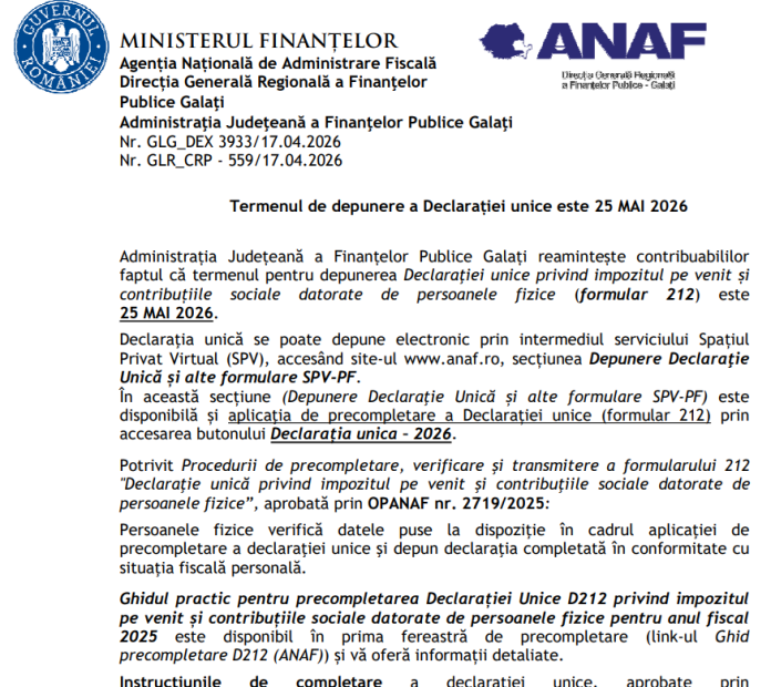 ANAF reamintește contribuabililor faptul că termenul pentru depunerea Declaraţiei unice privind impozitul pe venit și contribuțiile sociale datorate de persoanele fizice (formular 212) este 25 MAI 2026.