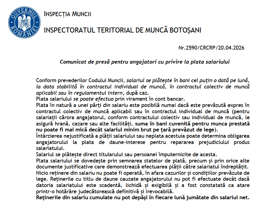 Potrivit ultimului comunicat ITM, conform prevederilor Codului Muncii, salariul se plătește în bani cel puțin o dată pe lună, la data stabilită în contractul individual de muncă, în contractul colectiv de muncă aplicabil sau în regulamentul intern, după caz.